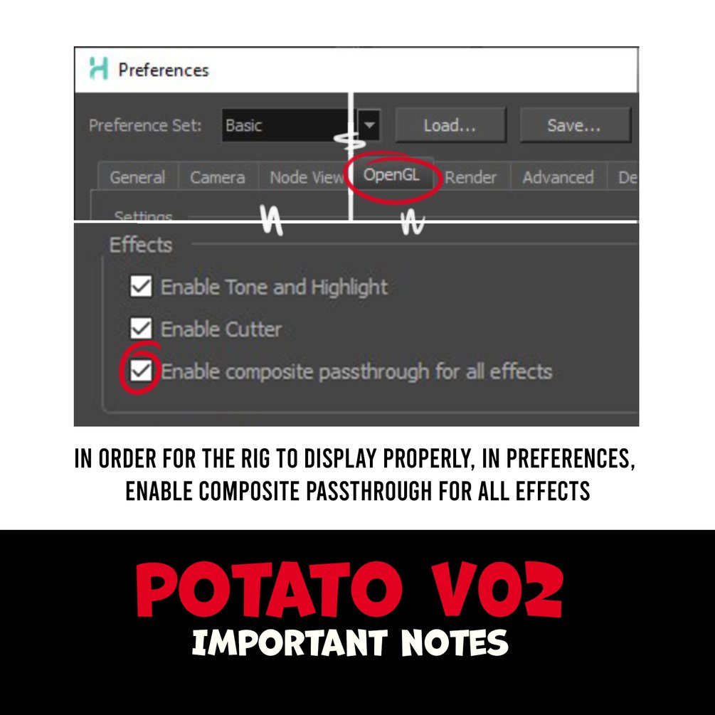 The Potato rig comes with a zipped .tpl Harmony Template file. It was created in Toon Boom Harmony Premium version 20. Just unzip it and open it up. Or, open the download location through your Harmony Library view and then drag the unzipped .tpl file into your Node View. The rig will only work fully in Toon Boom Harmony Premium.Have fun!