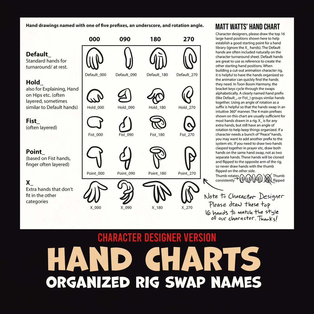 When building a 2D cut-out rig in Toon Boom Harmony, it helps to name and organize your drawing substitutions. There are three versions of this chart, a more in-depth version for the rigging artist, a simplified version to give to your character designer, and a flipped version in case you already drew most of the hands on the opposite side of the body.