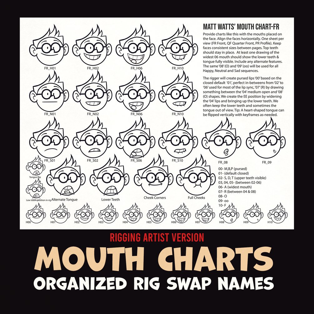 When building a 2D cut-out rig in Toon Boom Harmony, it helps to name and organize your drawing substitutions. There are two versions of this chart, a more in-depth version for the rigging artist, and a simplified version to give to your character designer.
